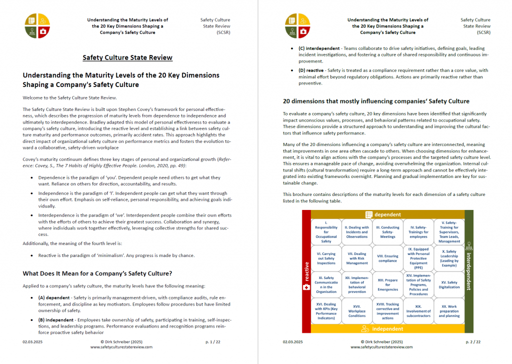 Understanding the Maturity Levels of the 20 Key Dimensions Shaping a Company’s Safety Culture Posted on March 2, 2025November 25, 2025 by DSchreiber In this small booklet, the maturity levels of the 20 dimensions that significantly influence a company-specific safety culture are described Free download